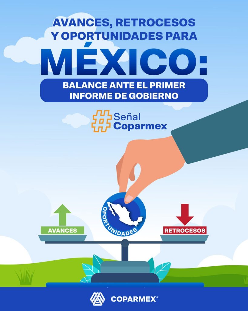 Ciudad de México.- En la antesala del primer informe de gobierno de la Presidenta de la República, Claudia Sheinbaum Pardo, desde COPARMEX hacemos un balance para identificar avances en favor de los mexicanos; retrocesos que frenan el desarrollo, limitan las libertades y dañan el Estado de Derecho, así como las oportunidades y las propuestas para contribuir a la construcción de un México mejor, con crecimiento, seguridad, paz y justicia social.