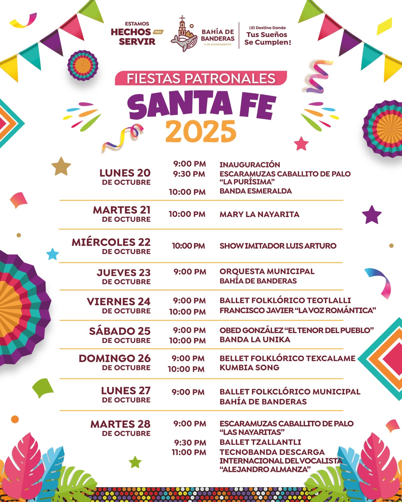 Bahía de Banderas.- El Gobierno Municipal de Bahía de Banderas invita a la ciudadanía a disfrutar de las tradicionales Fiestas Patronales 2025, que se llevarán a cabo en las colonias de Santa Fe, Altavela y Emilio M. González, donde se vivirán días llenos de música, baile y tradiciones que fortalecen la identidad cultural del municipio.