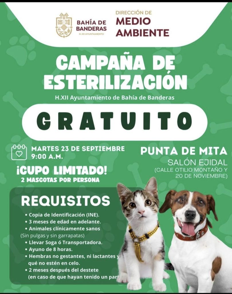 Bahía de Banderas.- El H.XII Ayuntamiento de Bahía de Banderas que encabeza el presidente municipal, Héctor Santana, a través de la Dirección de Medio Ambiente, ha anunciado que la próxima campaña de esterilización gratuita para perros y gatos, se llevará a cabo este martes 23 de septiembre, a partir de las 9:00 A.M., en el Salón Ejidal de Punta de Mita, ubicado en la calle Otilio Montaño y 20 de Noviembre.