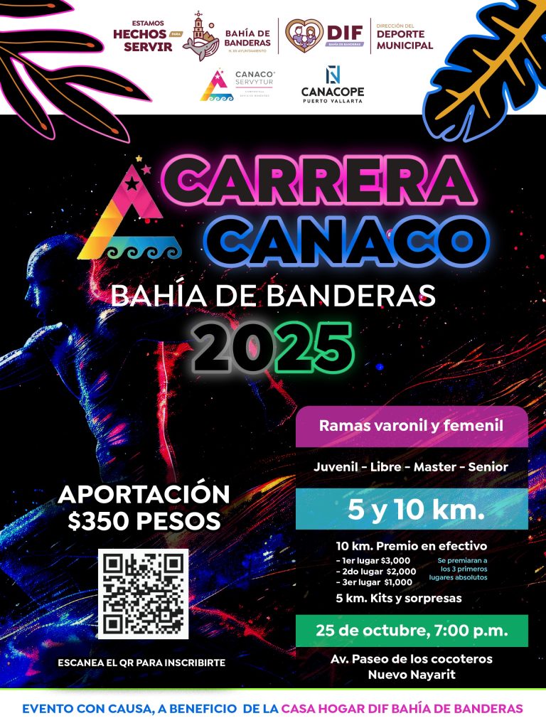 Bahía de Banderas.- La Cámara Nacional de Comercio, Servicios y Turismo (CANACO SERVYTUR) de Bahía de Banderas, en colaboración con el DIF Municipal y la Dirección del Deporte de Bahía de Banderas, anuncian la realización de la «Carrera CANACO Bahía de Banderas 2025».
