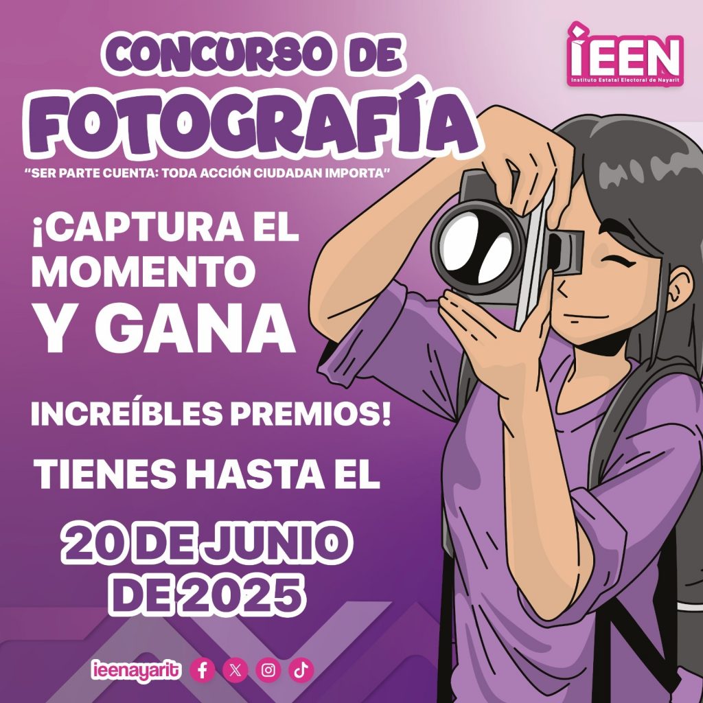 La recepción de las fotografías concluye el 20 de junio del presente año, el jurado calificador estará integrado por especialistas en la materia, quienes revisarán y seleccionarán las 3 mejores fotografías, el fallo será inapelable y será publicado el 27 de junio de 2025 a través de las redes sociales y página web del IEEN: https://ieenayarit.org/; consulta las características que deben llevar las fotografías en la convocatoria, para cualquier duda contáctanos en el teléfono 311-181-55-61, o al WhatsApp 311-246-0316, o bien, así como en el correo electrónico: educacioncivica.ieen@gmail.com