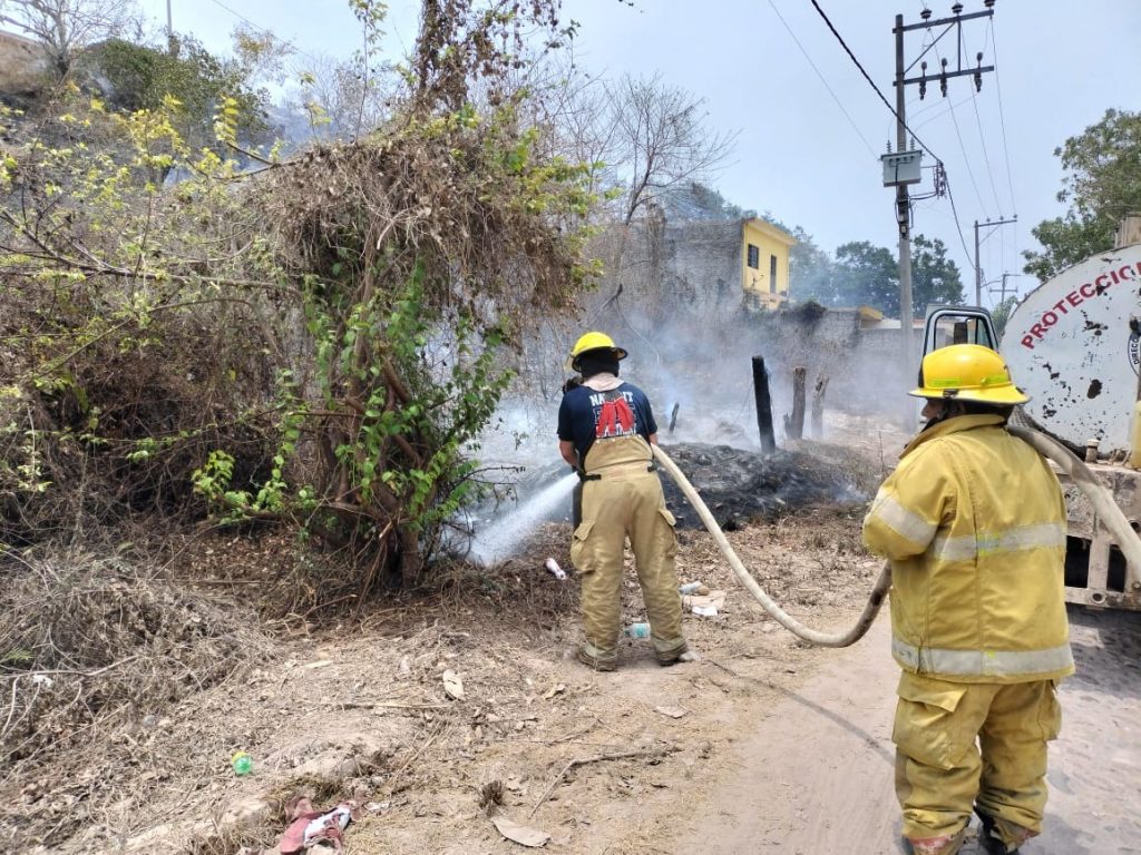 Derivado de una llamada de auxilio recibida por medio de la línea de emergencias 9-1-1, en la que se informó sobre un incendio de pastizal que corría riesgo de programarse hacia unas viviendas en la colonia Lombardo Toledano, del municipio de Acaponeta Los Bomberos acudieron a sofocarlo.