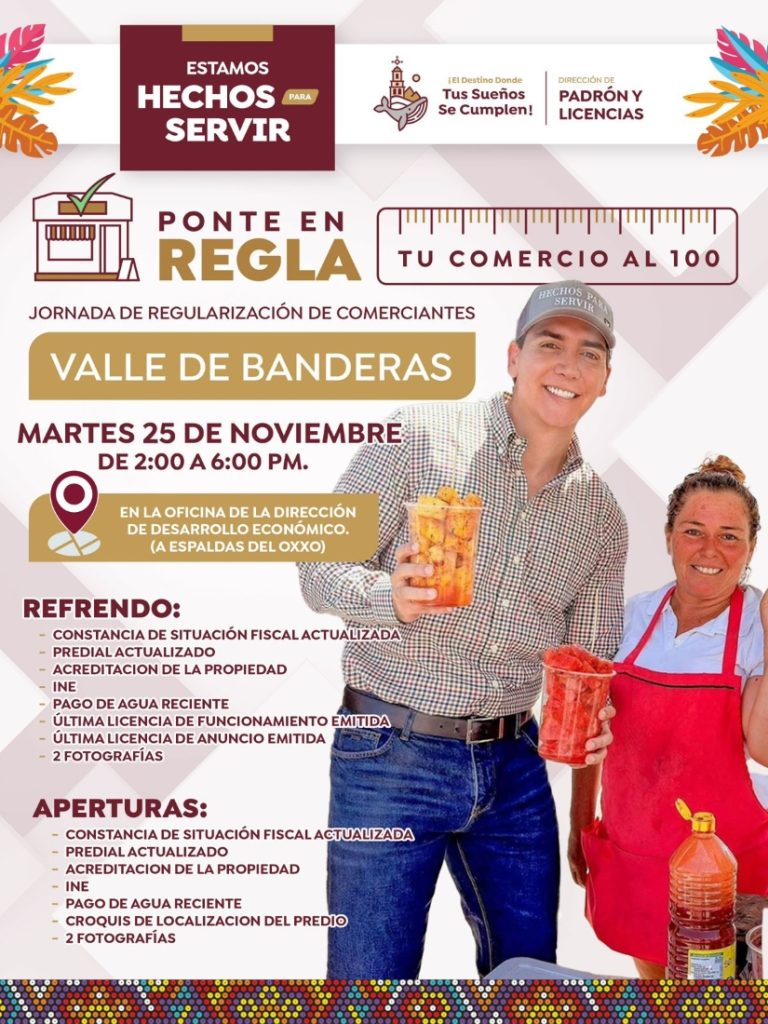 Esta jornada se llevará a cabo este martes 25 de noviembre, en la Oficina de la Dirección de Desarrollo Económico (a espaldas del Oxxo) en Valle de Banderas, con un horario de atención de 2:00 p.m. a 6:00 p.m.