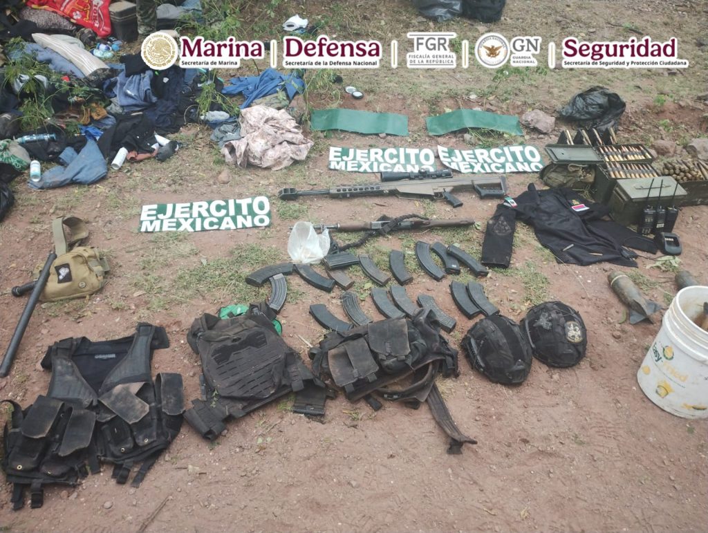 Ahí se hallaron tres armas largas, 1,770 cartuchos de diferentes calibres, 37 cargadores, un paquete con marihuana, un paquete con cocaína, cuatro camionetas con blindaje artesanal, entre los que se encontraba una unidad apócrifa de una institución de seguridad federal, 42 artefactos explosivos improvisados, dos radios, seis chalecos con placas, cuatro cascos y ropa táctica.