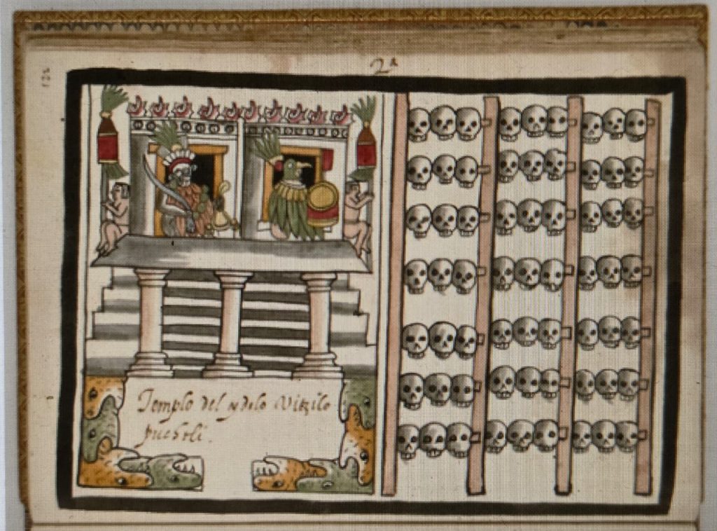 Ahora recuerdo que Huitzilopochtli puede traducirse como “colibrí zurdo”; que Tlaltecuhtli era la deidad mexica de la tierra, devoradora de muertos; que un tzompantli era una estructura en la que se exhibían cráneos de enemigos de guerra sacrificados, ensartados en estacas de madera y que Tenochtitlan era una isla rodeada de cinco lagos.