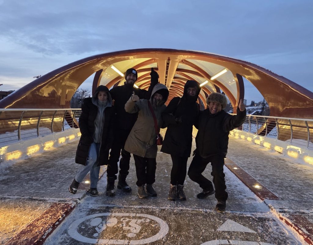En frígida, álgida tarde-noche, transitamos los 130 metros del Puente de la Paz en Calgary, pintado de un brillante rojo canadiense, inaugurado el 12 de marzo de 2012, obra del arquitecto español Santiago Calatrava, estructura helicoidal que cruza el río Bow, fabricado de vidrio y acero, cubierto de cristal e iluminado excelso y colosalmente durante la noche.