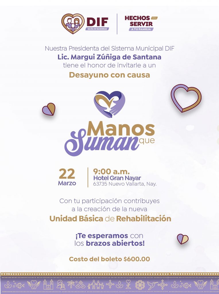 Bahía de Banderas.- La presidenta del Sistema Municipal DIF Bahía de Banderas, Margui Zúñiga de Santana, invita a la ciudadanía a sumarse al Desayuno con Causa “Manos que Suman”, un evento solidario que busca recaudar fondos para la creación de una Unidad Básica de Rehabilitación en el municipio.
