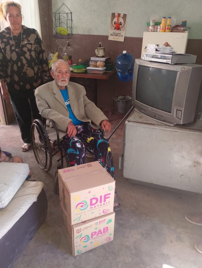 Tepic.- Gracias a la sensibilidad y compromiso de la doctora Beatriz Estrada Martínez, presidenta del Sistema DIF Nayarit, la institución brinda apoyo integral al señor José Sandoval Arellano, de 89 años de edad, quien recibió una silla de ruedas, una andadera y despensas; además, se le harán llegar pañales y otros apoyos que contribuyan a mejorar su calidad de vida.