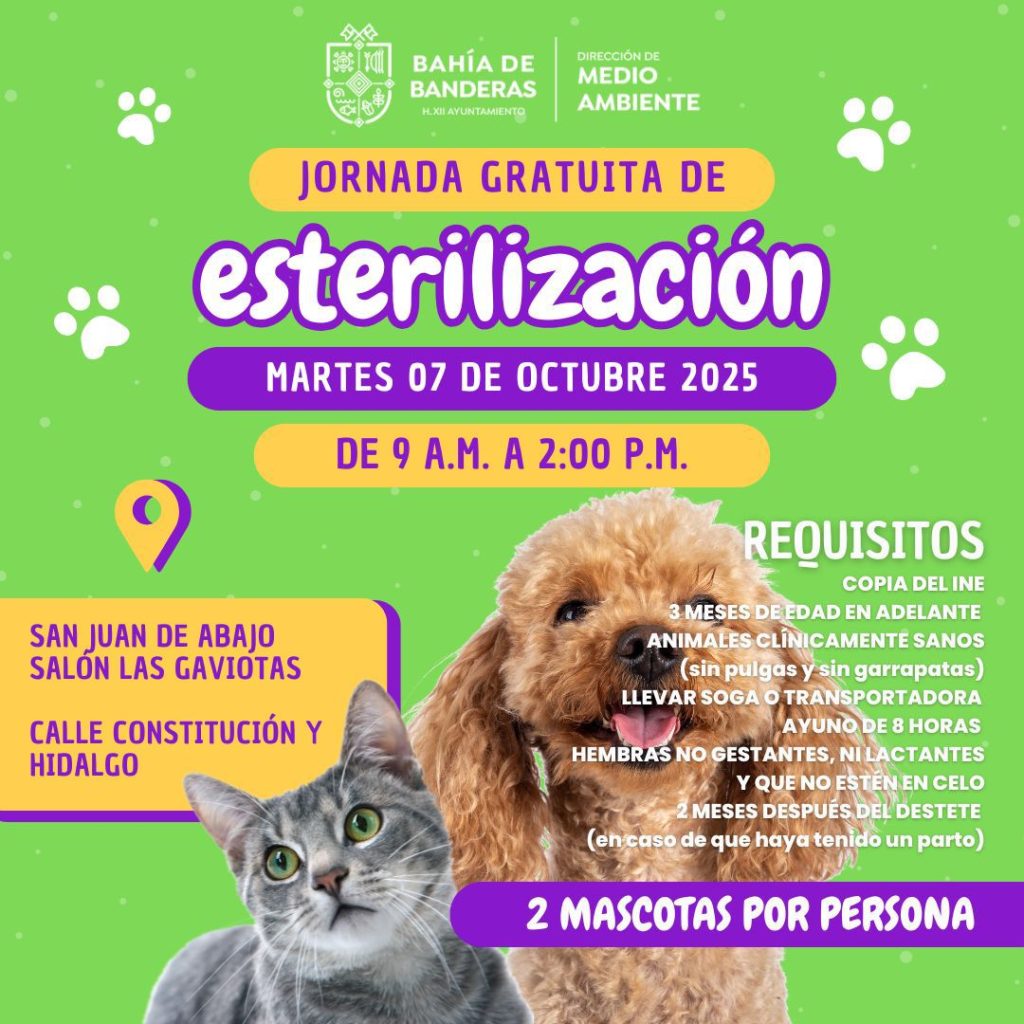 Bahía de Banderas.- El Gobierno de Bahía de Banderas, que encabeza el presidente municipal Héctor Santana, a través de la Dirección de Medio Ambiente, invita a todos los dueños de mascotas a participar en la jornada gratuita de esterilización que se realizará este próximo martes 7 de octubre de 2025, de 9:00 de la mañana a 2:00 de la tarde, en el Salón Las Gaviotas, ubicado en calle Constitución y calle Hidalgo, en San Juan de Abajo.
