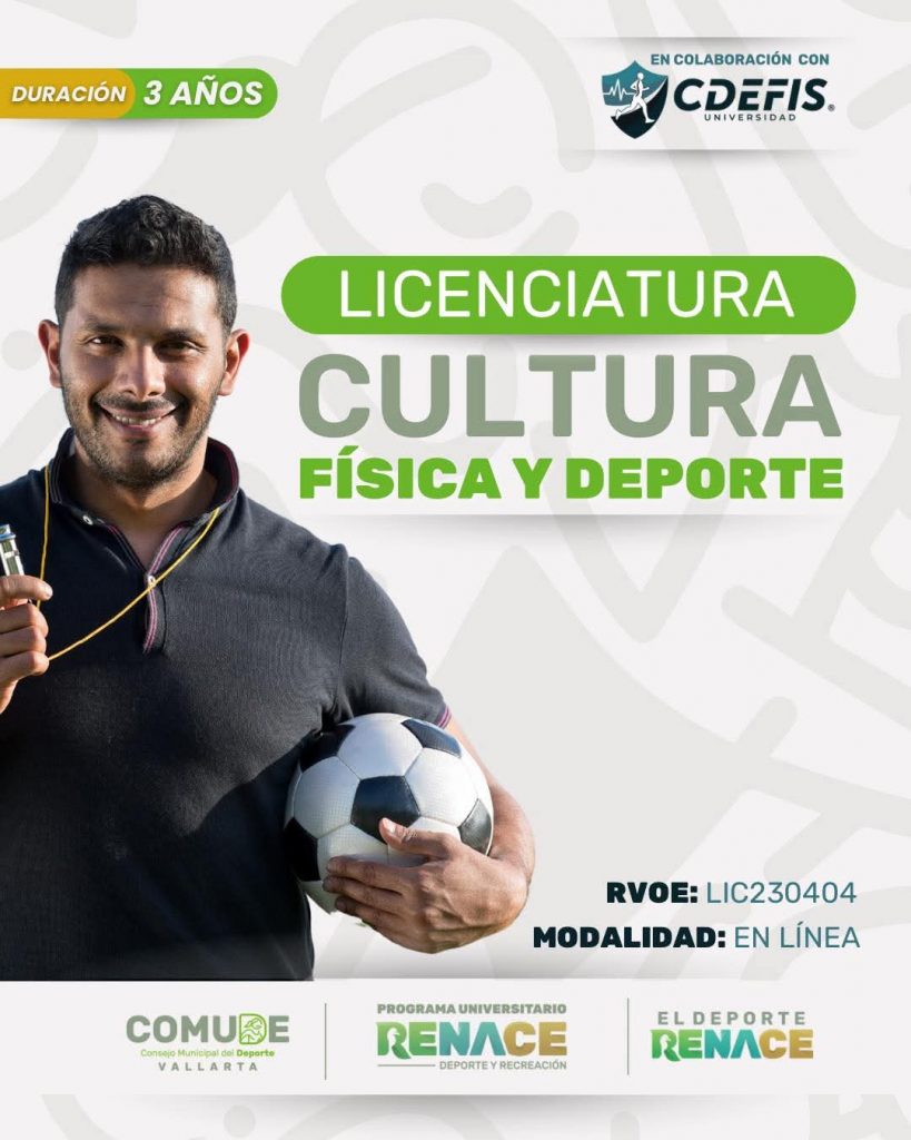 Puerto Vallarta.- Si te apasiona el deporte y sueñas con convertirlo en tu profesión, esta es tu oportunidad. El Consejo Municipal del Deporte de Puerto Vallarta, en colaboración con la Universidad CDEFIS, abrió la convocatoria para estudiar la Licenciatura en Cultura Física y Deporte a través del programa universitario RENACE. Con validez oficial (RVOE: LIC230404), este programa tiene una duración de tres años, modalidad en línea y clases sabatinas de 9:00 a 13:00 horas.