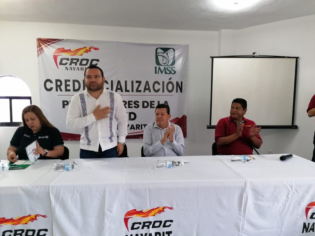 Tepic.- El titular del Instituto Mexicano del Seguro Social (IMSS) en Nayarit, doctor José de Jesús Chávez Martínez, y el secretario general de la Confederación Revolucionaria de Obreros y Campesinos (CROC) en la entidad, Armando Cárdenas Niz, sostuvieron una reunión de trabajo con el propósito de fortalecer los acuerdos en materia de salud y bienestar para los trabajadores afiliados a esta organización.