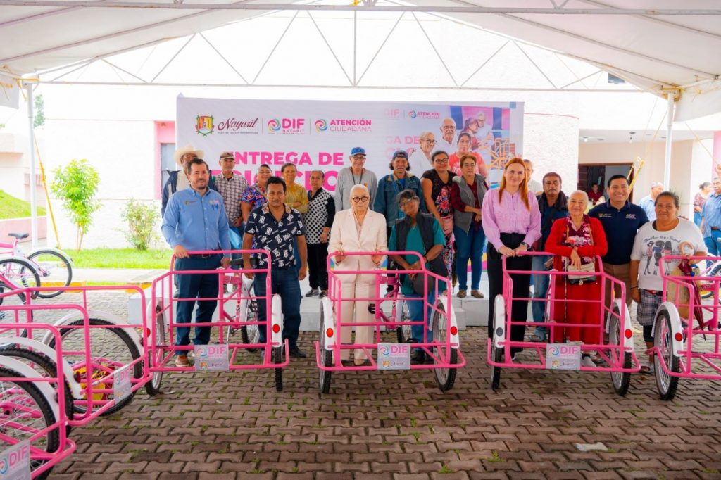 Tepic.- Impulsar el desarrollo y mejorar el nivel de vida de los grupos prioritarios del estado es una tarea permanente para la presidenta del Sistema DIF Nayarit, doctora Beatriz Estrada Martínez, quien encabezó la entrega gratuita de 53 triciclos de carga a igual número de familias de los municipios de Tepic, Xalisco, San Blas y Compostela.