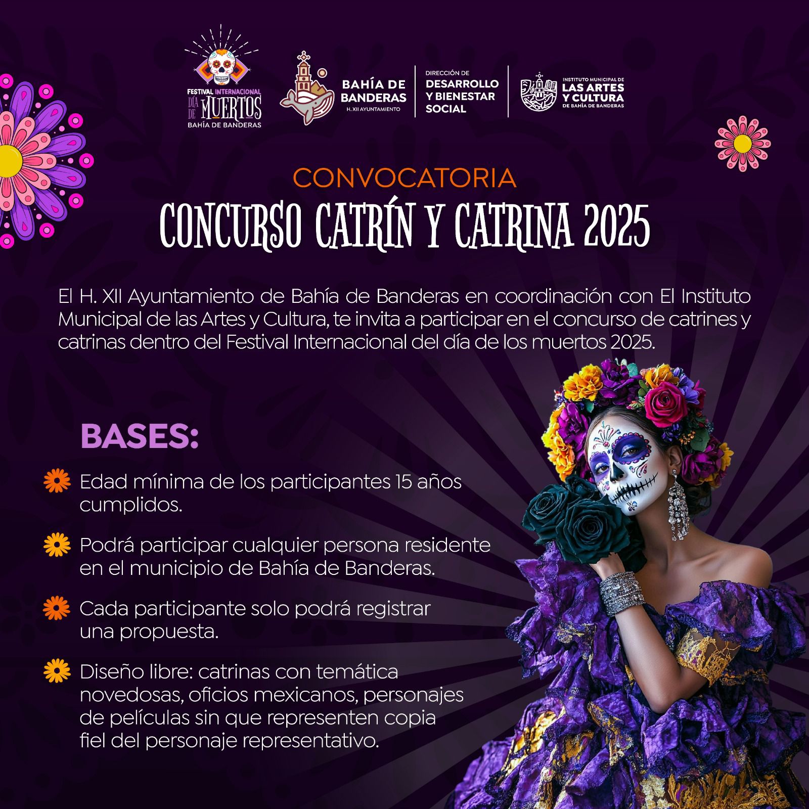 Bahía de Banderas.- En el marco del Festival Internacional del Día de Muertos Bahía de Banderas 2025, el H. XII Ayuntamiento, que encabeza el alcalde Héctor Santana, a través del Instituto Municipal de las Artes y Cultura, en coordinación con la Dirección de Desarrollo y Bienestar Social, lanzó la convocatoria para participar en el Concurso de Catrín y Catrina 2025, que se llevará a cabo el próximo viernes 31 de octubre a las 7:00 p.m. en la plaza pública de Sayulita.