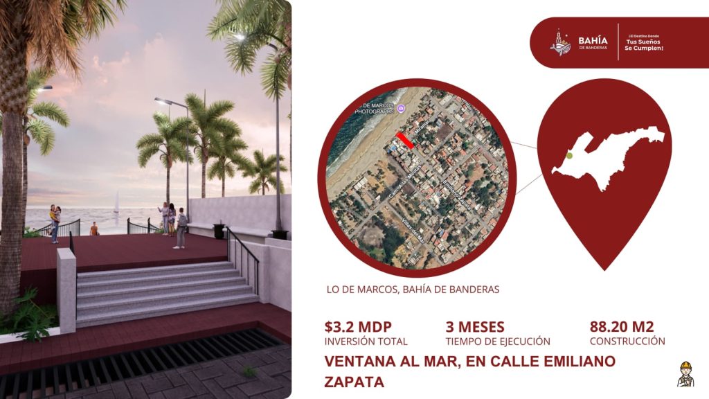 De acuerdo con la planeación de la obra, la Ventana al Mar tendrá una inversión aproximada de 3.2 millones de pesos y un tiempo estimado de ejecución de tres meses, integrando además elementos de mejora urbana como andadores, iluminación y áreas que permitirán a residentes y turistas disfrutar de un acceso seguro a la playa.