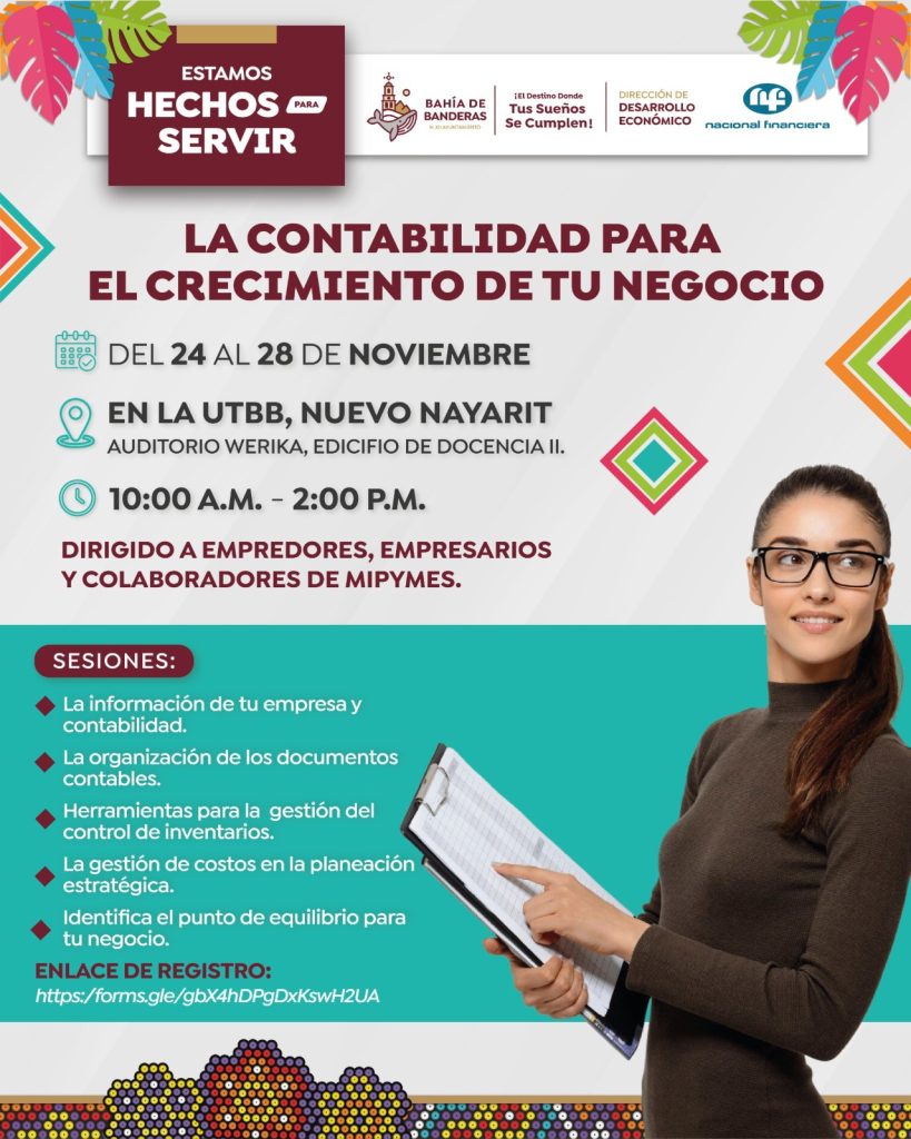 Bahía de Banderas.- El Gobierno Municipal de Bahía de Banderas, a través de la Dirección de Desarrollo te invita a participar del 24 al 28 de noviembre en el taller «La Contabilidad para el crecimiento de tu negocio» qué está dirigido a emprendedores, empresarios y colaboradores de MIPYMES, esto con el objetivo de fortalecer los conocimientos en gestión contable. Esta capacitación se realizará en las instalaciones de la UTBB, en el Auditorio Werika ubicado en el Edificio de Docencia II, en un horario de 10:00 a. m. a 2:00 p. m.