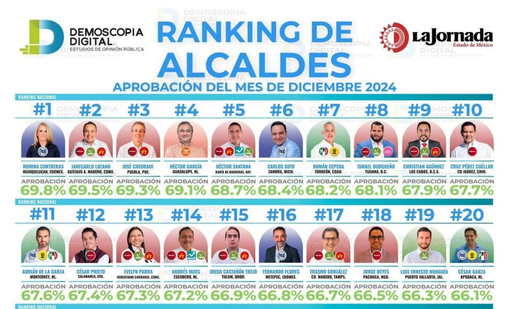 Bahía de Banderas.- El presidente municipal de Bahía de Banderas, Héctor Santana García, fue reconocido como el quinto mejor alcalde del país, de acuerdo con el Ranking Nacional de Aprobación correspondiente al mes de diciembre de 2024, elaborado por la empresa Demoscópica Digital.
