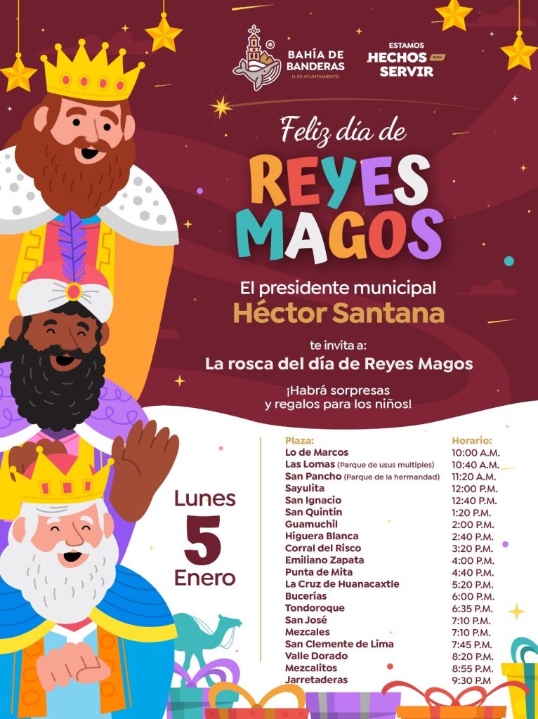 Bahía de Banderas.- Con motivo del Día de Reyes, el H. XII Ayuntamiento de Bahía de Banderas, encabezado por el presidente municipal Héctor Santana, hace la invitación a todas las familias del municipio a participar en las partidas de rosca que se llevarán a cabo los próximos días 5 y 6 de enero en diferentes localidades.