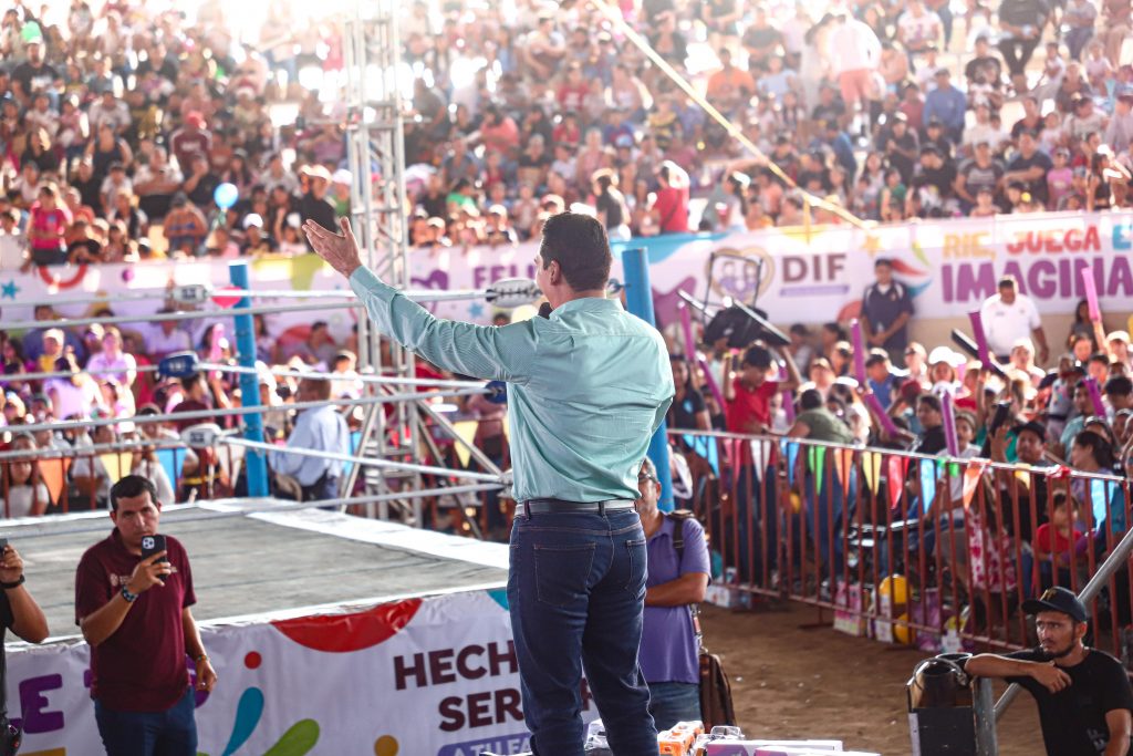 Entre risas y emoción, niñas y niños recibieron sorpresas como bicicletas, consolas de videojuegos, laptops, sillas gamers, libritos para colorear, y alimentos para disfrutar en familia. “Lo que vayan a ver en el cuadrilátero no hay que hacerlo en casa”, advirtió el alcalde entre risas.