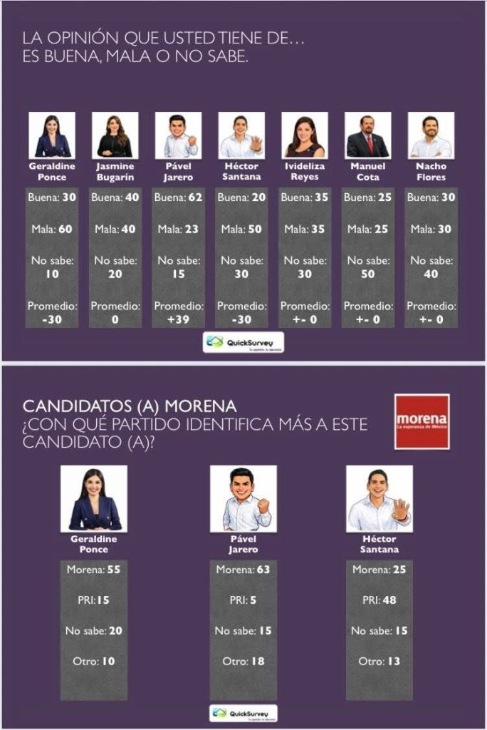 Respecto a la identificación partidista, Ponce mantiene 55 por ciento de asociación con Morena, mientras que Pável Jarero alcanza 63 por ciento. En contraste, Héctor Santana es identificado en mayor medida con el Partido Revolucionario Institucional con 48 por ciento, mientras que solo 25 por ciento lo relaciona con Morena.