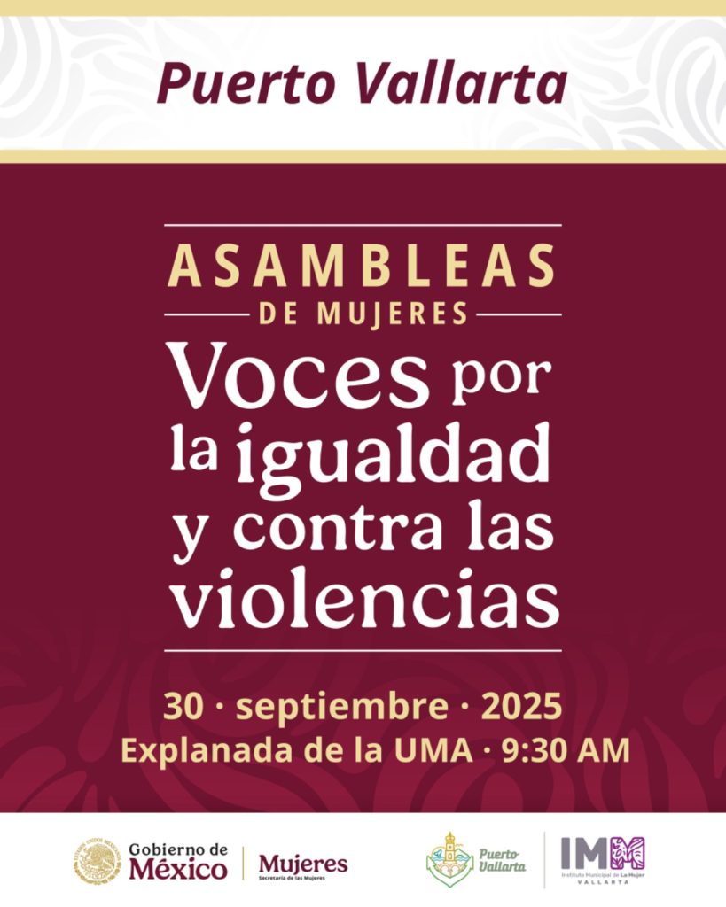 Puerto Vallarta.- Este 30 de septiembre, Puerto Vallarta será sede de la Asamblea “Voces por la Igualdad y contra las Violencias”, un espacio donde las mujeres podrán compartir experiencias y alzar la voz por una vida libre de violencias. La cita es a las 9:30 de la mañana en la explanada de la UMA, con el respaldo del gobierno de Luis Munguía González y del Instituto Municipal de la Mujer que dirige Sarahy Hernández.