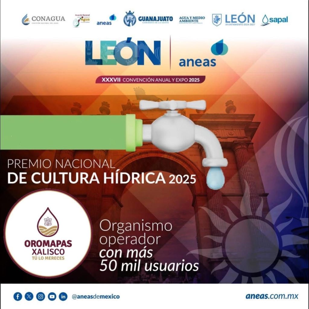 Xalisco.- Por primera vez desde su creación, el Organismo Operador Municipal de Agua Potable, Alcantarillado y Saneamiento de Xalisco (OROMAPAS) obtuvo el Premio Nacional de Cultura Hídrica 2025, otorgado por la Asociación Nacional de Entidades de Agua y Saneamiento de México A.C. (ANEAS).