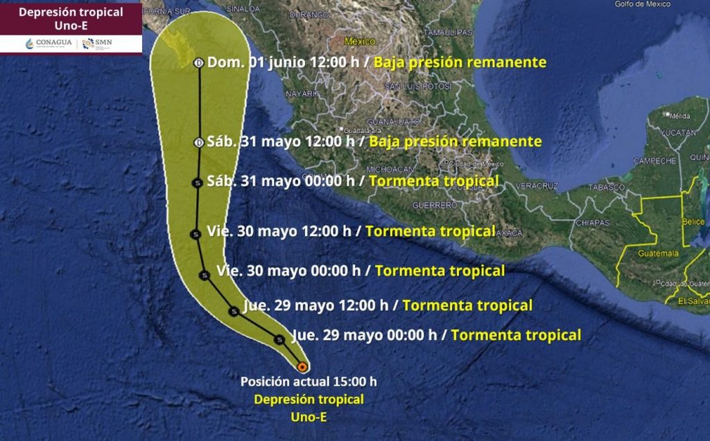 Ciudad de México.- A las 15:00 horas de este miércoles 28 de mayo, tiempo del centro de México, se formó la depresión tropical Uno-E, al sur de las costas de Guerrero, primer ciclón tropical de la temporada 2025 en el océano Pacífico Nororiental. Su centro se localizó aproximadamente a 720 kilómetros (km) al sur-suroeste de Zihuatanejo, Guerrero, y a mil 340 km al sur-sureste de Cabo San Lucas, Baja California Sur, con vientos máximos sostenidos de 55 kilómetros por hora (km/h), rachas de 75 km/h y desplazamiento hacia el noroeste a 15 km/h.
