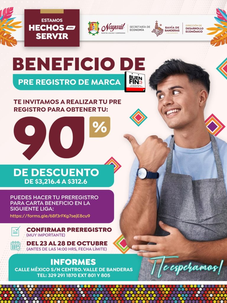 Bahía de Banderas.- El Gobierno de Bahía de Banderas, que encabeza el presidente municipal Héctor Santana, en coordinación con la Secretaría de Economía del Estado de Nayarit y la Dirección de Desarrollo Económico Municipal, anunció un importante beneficio para emprendedores y negocios locales, un 90 por ciento de descuento en el preregistro de marca, como parte de la campaña de El Buen Fin.