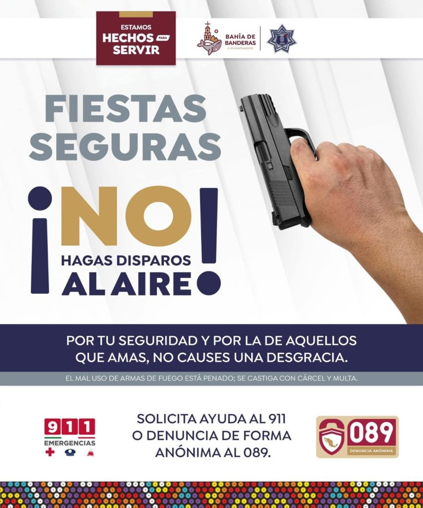 Bahía de Banderas.- En el marco de las celebraciones de año nuevo, el H. XII Ayuntamiento de Bahía de Banderas, hace un llamado a la ciudadanía, de llevar las celebraciones con responsabilidad y evitando los disparos al aire.