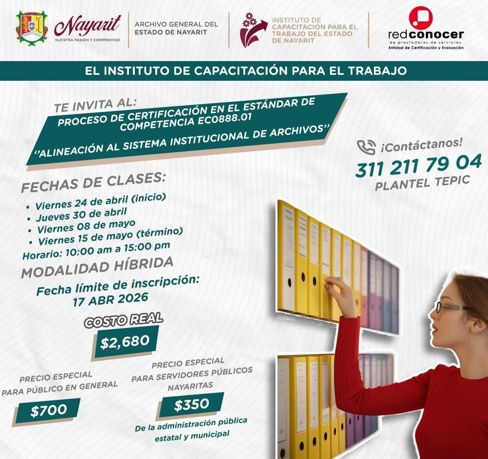 Tepic. – El Gobierno del Estado de Nayarit, a través del ICATEN, invita a participar en el Proceso de Certificación en el Estándar de Competencia EC0888.01: Alineación al Sistema Institucional de Archivo, dirigido a quienes buscan fortalecer sus conocimientos en organización, control y gestión documental con validez oficial.