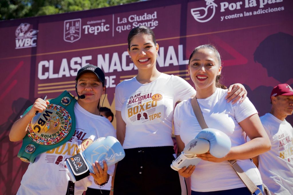 Tepic.- La presidenta municipal de Tepic, Ingeniera Geraldine Ponce Méndez, encabezó el entrenamiento de boxeo junto a la campeona mundial Asley «La Chiquita» González, con la presencia de más de 600 personas en la Unidad Deportiva Morelos.